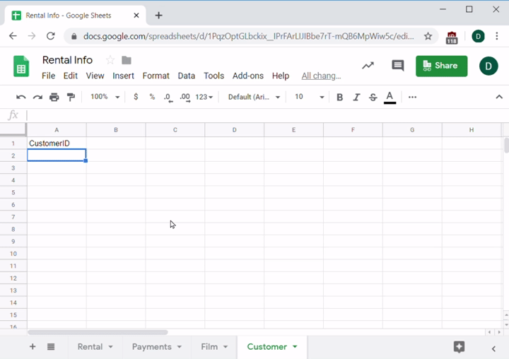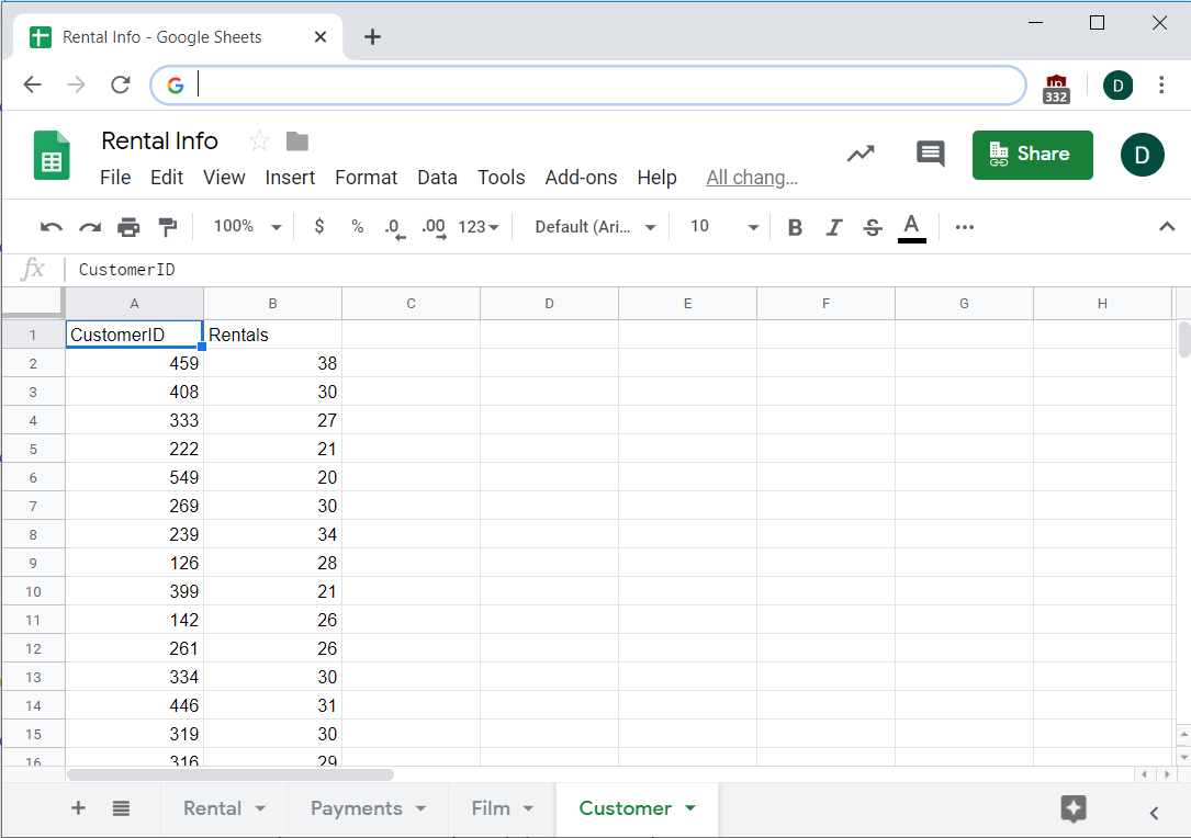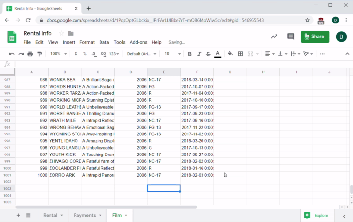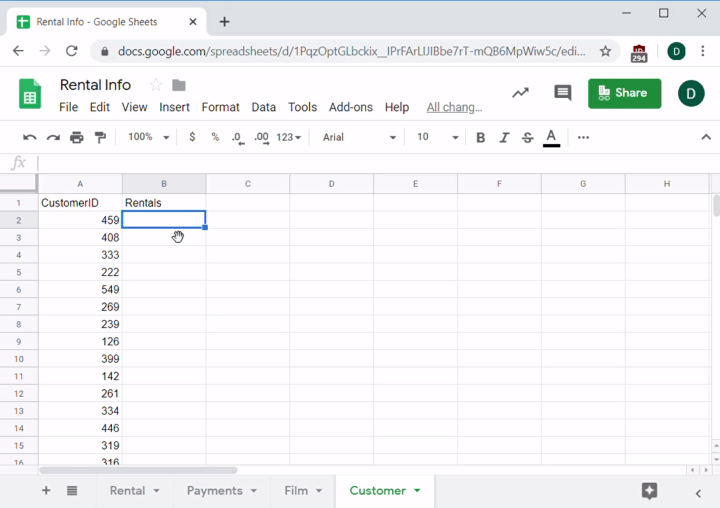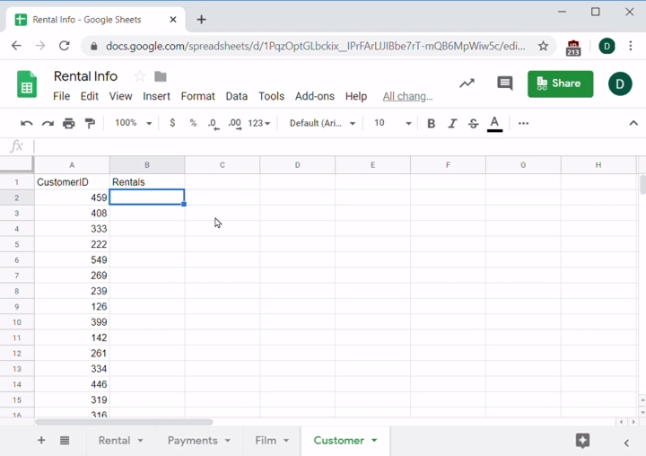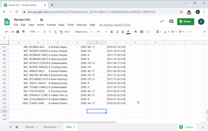 Imagine you work for an online video rental service. Your sales team has a new potential film distributor, but they need a few questions answered to seal the deal. You don't have access to the database, so your engineers did a quick database dump into a few CSV files that you imported into Sheets.