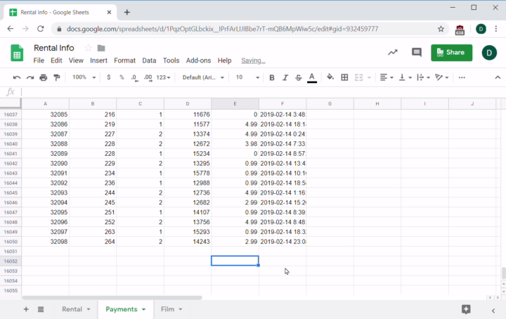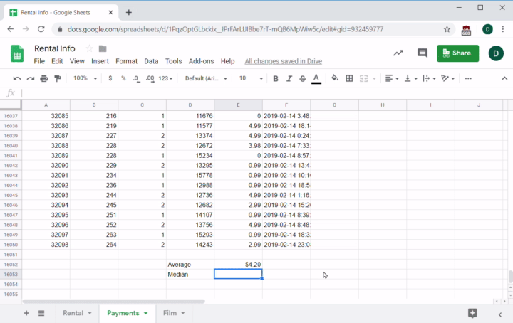 The next question your sales team asks you is what's the average payment price of a rented film. For this one, you'll use the AVERAGE function. This function averages the items in the range you give it. In this case, it's =AVERAGE(E2:E16050).