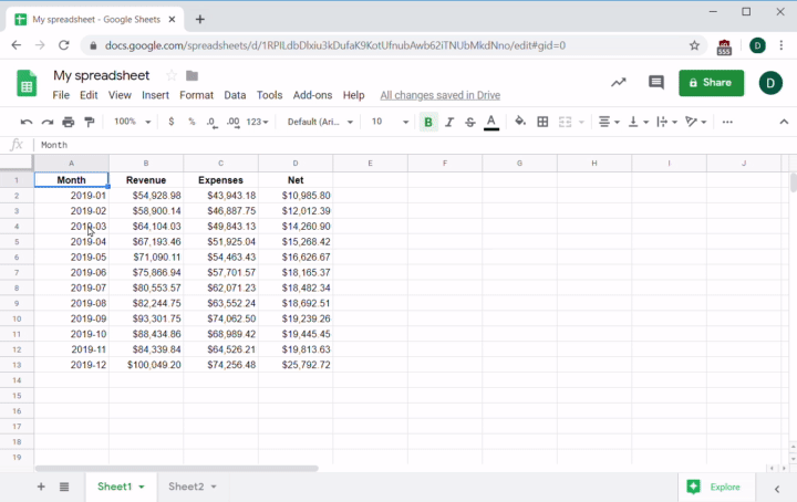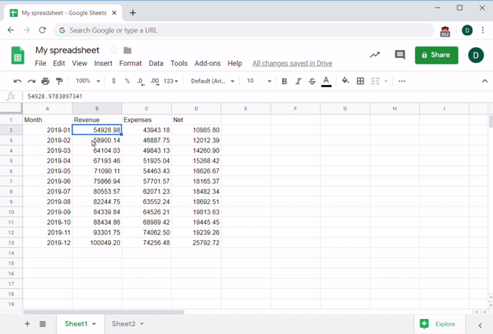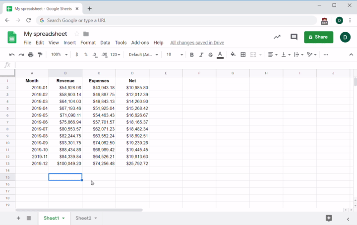 Since you do have that information, you can compare the result to the one in cell D8, and verify that the formula properly calculated the net value. Next, you can easily expand this formula to calculate the net value for every row in the sheet. To do this, place your cursor on the square at the bottom right of the selected cell containing the formula, and drag to apply the formula to a range of desired empty cells. Alternatively, you can just copy the formula, select the cells you want to paste it into, then hit Paste. This works with either the Edit menu or your keyboard shortcuts: