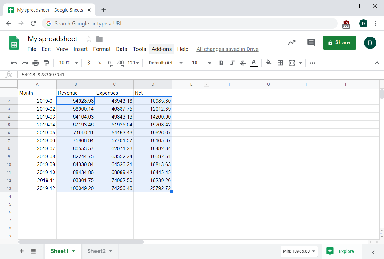 For example, suppose you wanted to add a total revenue column to the sample spreadsheet you've been using. One way to do this is to just add up the individual cells, like =B2+B3+B4+…, but that gets tedious quickly and might be impossible with larger datasets.