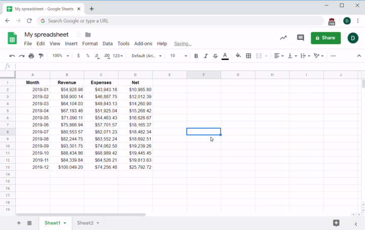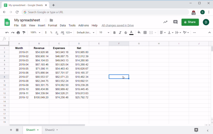 On the most basic level, you can use spreadsheets to make simple math calculations quick and easy. For example, imagine that the net column information (representing the net profit for each month) was missing from your original file, and you only had the data for the revenue and expenses. You could easily calculate the net value, which equals revenue minus expenses. In the below spreadsheet, you would do this by selecting an empty cell (here, F8 is selected) and entering a formula to calculate the net value: =B8-C8.