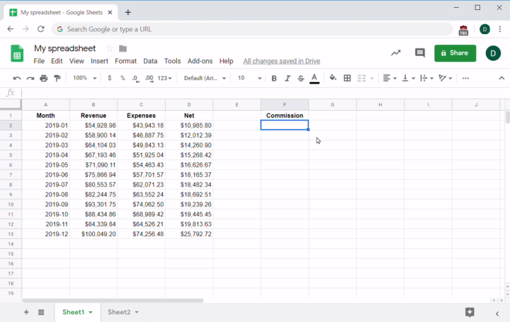 Simple math formulas (addition, division, subtraction, and multiplication) can also be used with plain numbers instead of cell addresses. For example, say your sales team gets a 10% commission on revenue. You could easily calculate the sums of their commission by using a formula to multiply every value in the Revenue column by 10%: