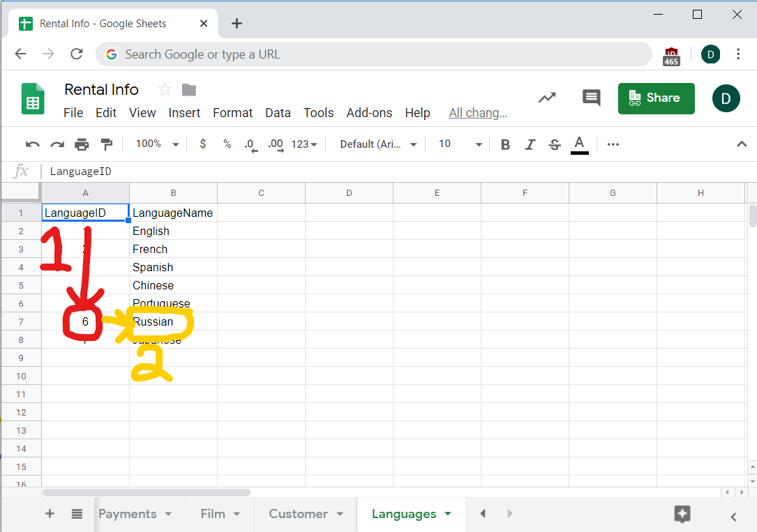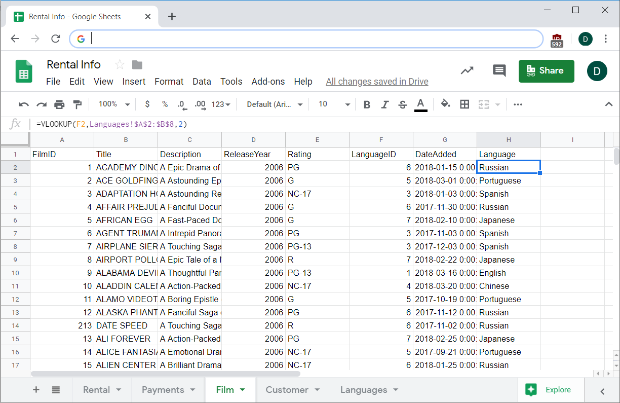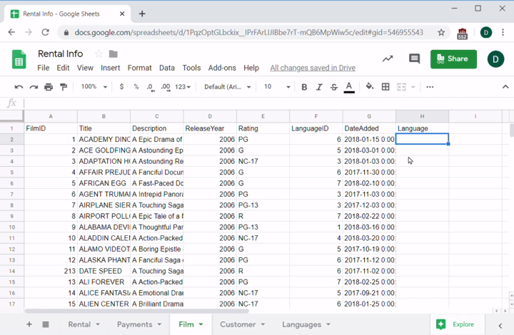 For example, check the Film sheet and LanguageID column. It would be really nice if instead of numbers you just had the language name. How can you combine the Language and Film sheets so that each film has the name of the language in it?