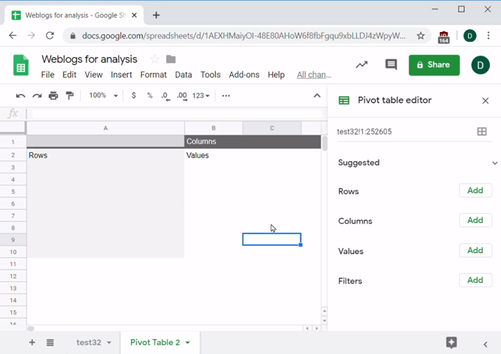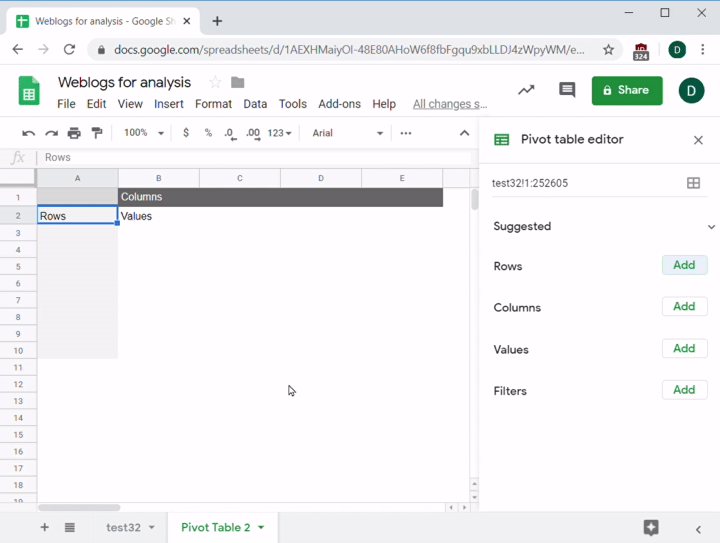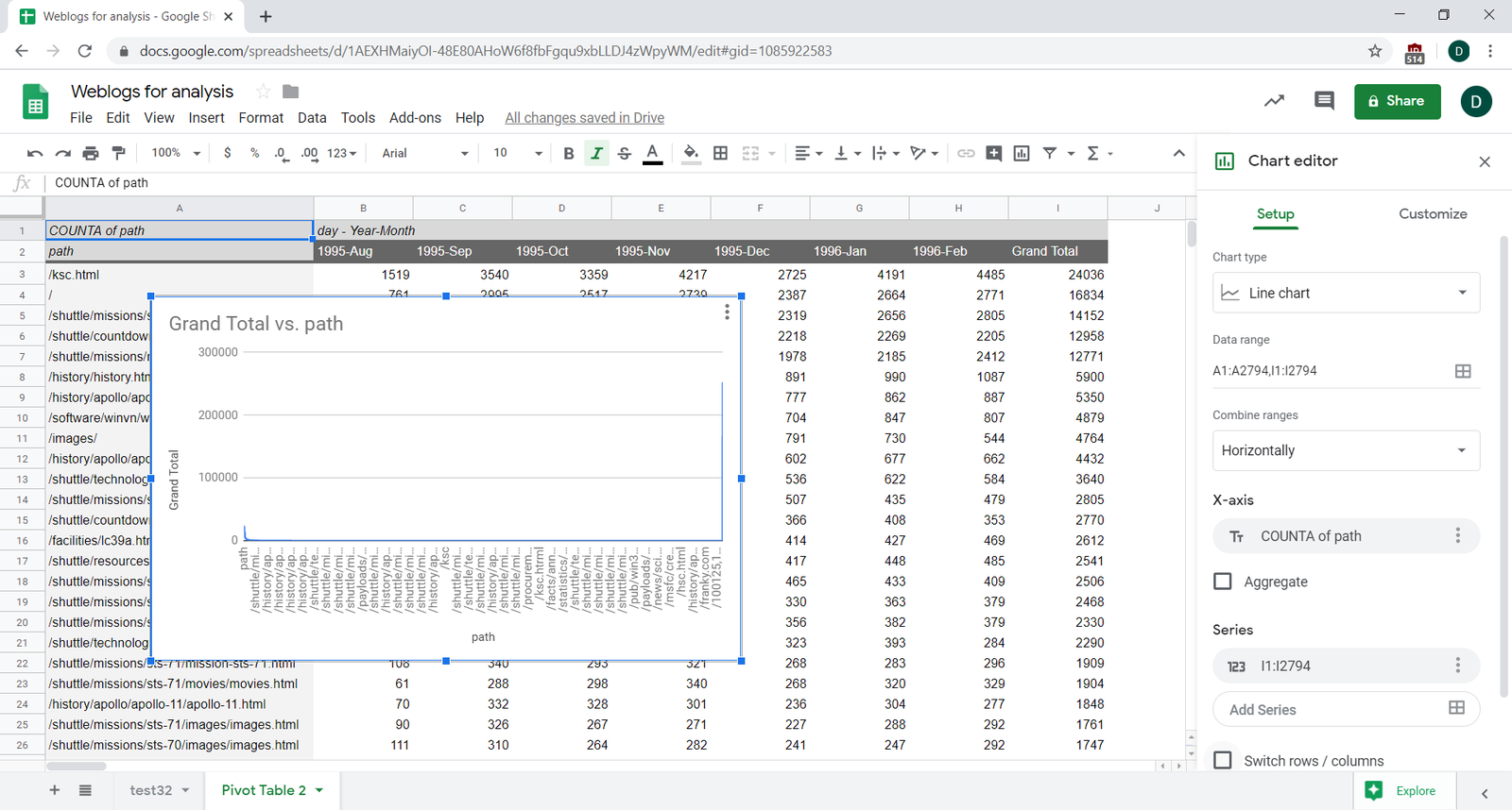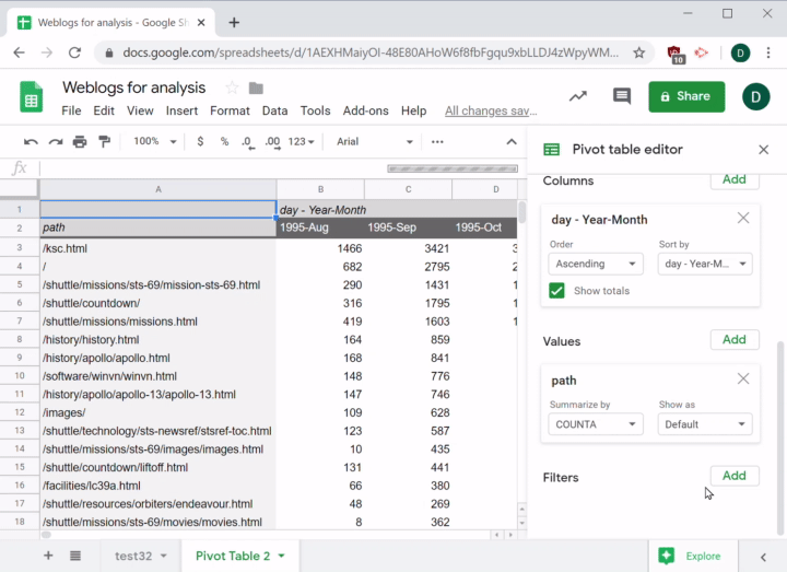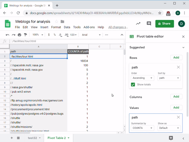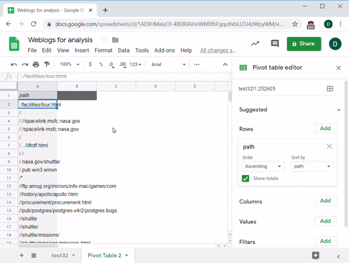 Now you're ready to set up your data. You want each row to represent a web page, so under the Rows section hit Add and choose Path. You'll see that a list of all the unique paths appears. This can take a few seconds. If you don't see the editor on the right side of your screen, click on cell A1 in the pivot table: