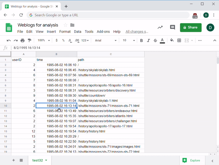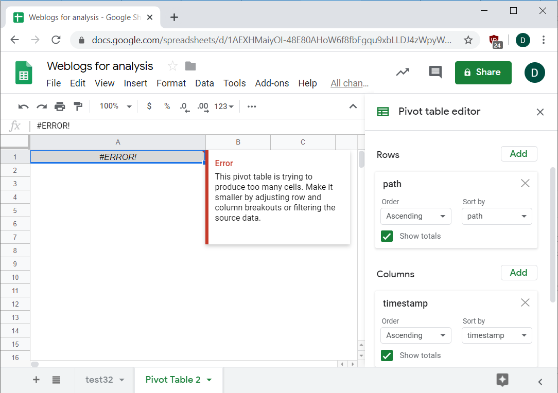 Before you move forward and try to add those into the pivot table editor, there are a few more important things to know. First, pivot tables have limits on the amount of data you can add to them. If you put the timestamps in the columns and paths as rows, Sheets will not be able to process all that data and will give you an error message: