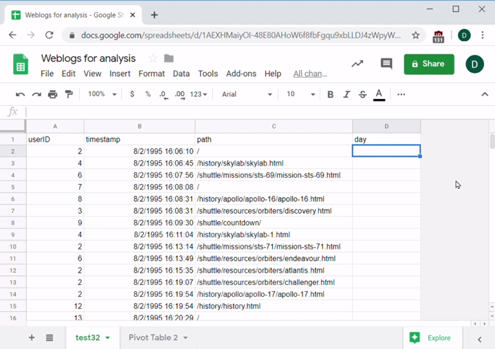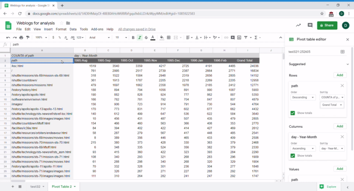 A pivot table is a feature in spreadsheet apps that lets you transform raw data into more usable forms. Here's a quick example of what they can do. Imagine you have some raw page view data for your website that spans over a year like the data linked here. This is actual web log data from NASA's website nearly 20 years ago!