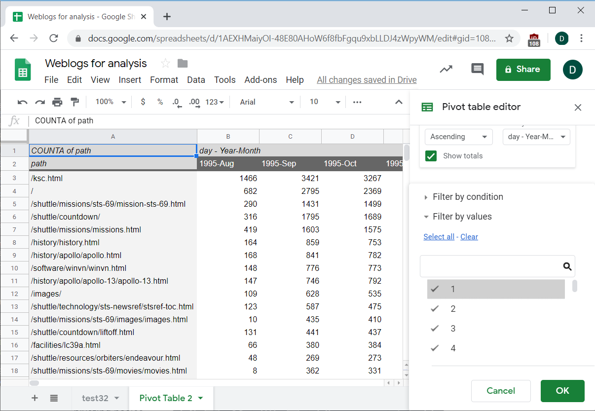 To finish up this pivot table, follow the same process as before—create a row for each path, and the value will be the count of paths. You'll sort the table the same way, too: descending by count. Note that there's a new option when sorting: because there are columns, you can make the pivot table sort by any individual column. For example, you can sort by Aug-1995 or sort by the total of all columns. First, you can sort by Grand Total: