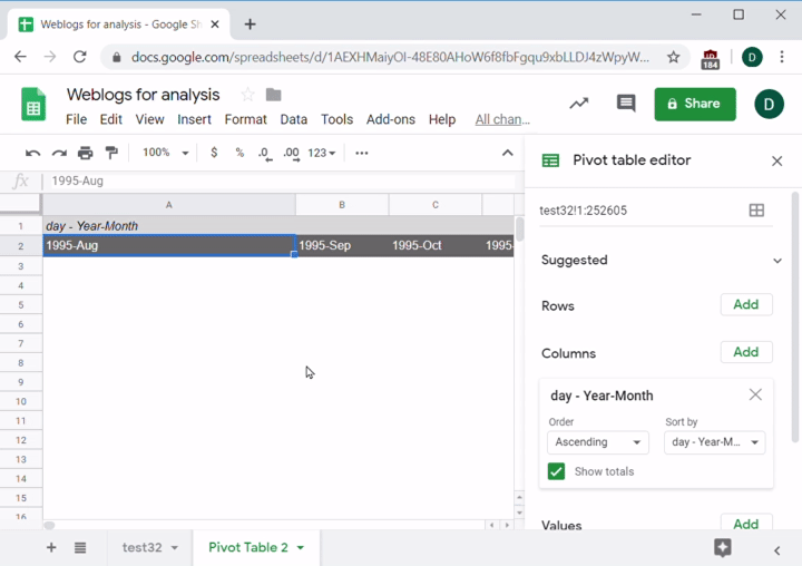 Go back to the pivot table. Add the date as a column to the pivot table. Now you can make Sheets group the dates by weeks or months. You can start with months—right click any value in that row, select Create Pivot Date Group, then pick Month-Year. Be careful—if you just choose Month, it will lump together July 2018 data with July 2019 data!