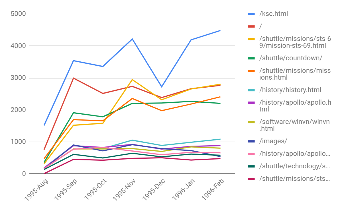 As you can see, the graph communicates information pretty clearly, making it easy to see which were the top pages on your NASA site over a time period of several months. Note that the numbers in the first month look pretty low compared to other months. That probably means the data is incomplete for that month, and you should remove it when doing any analysis. Also note the big dip in December for your top page, ksc.html. That's probably because there aren't as many tourists visiting the Kennedy Space Center in Cape Canaveral in December due to the holidays. See how much easier it is to understand what is going on with your website when you visualize it?
