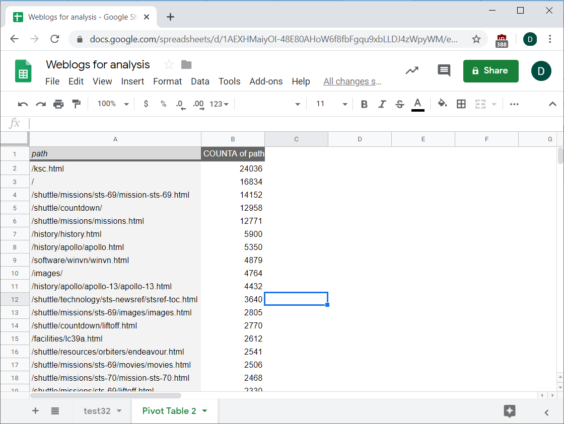 For this exercise, you’ll use COUNTA on the paths. The difference between COUNT and COUNTA is that COUNT only counts numbers, while COUNTA counts any nonempty cell. There are many other functions available too, like SUM, AVERAGE, MEDIAN, and others. Make sure to choose the function that best fits the information you are trying to get.