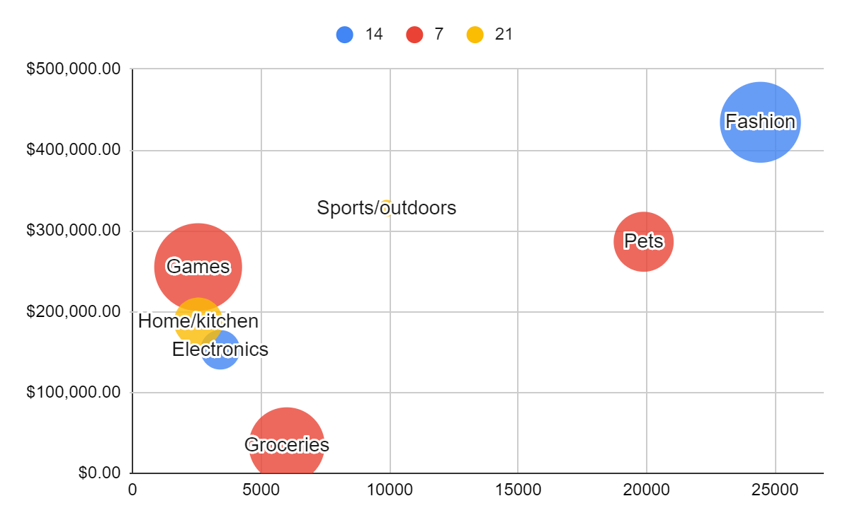 | Home/kitchen | 2558 | $187,332.00 | 21 | 10.44% |
