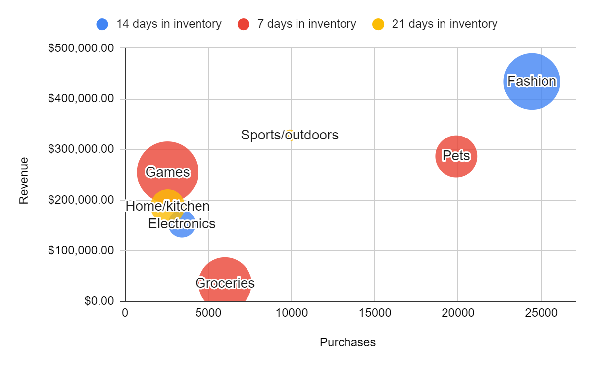 | Category | Purchases | Revenue | Days in inventory | Margin |
