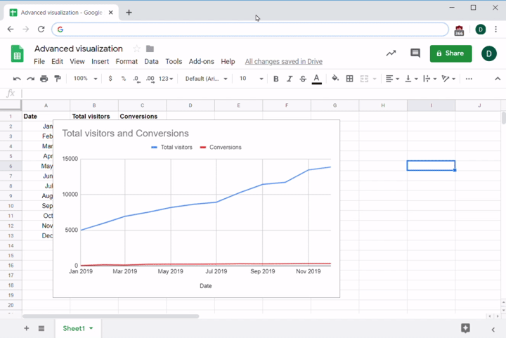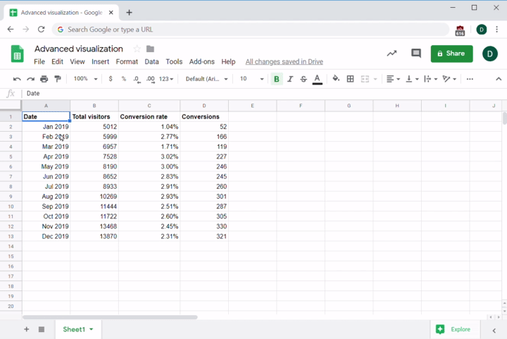 One way to do this is to use a line and column graph, where columns represent total visitors and a line represents the conversion rate. The decision about which data goes where is not arbitrary; in this kind of visualization, the convention is to graph percentages on a line and total numbers data in columns. You can see the steps for creating such a graph below: