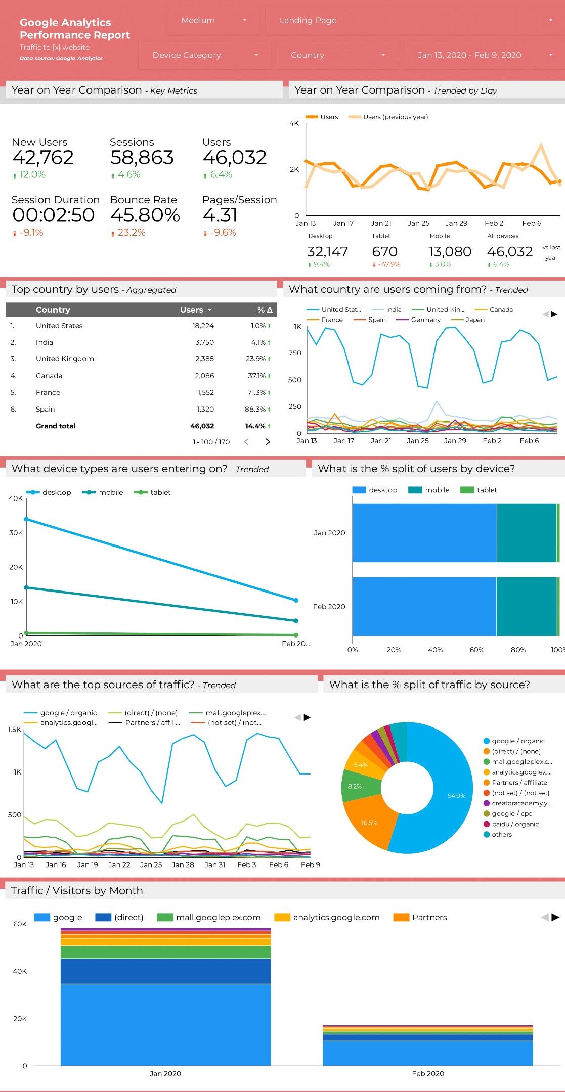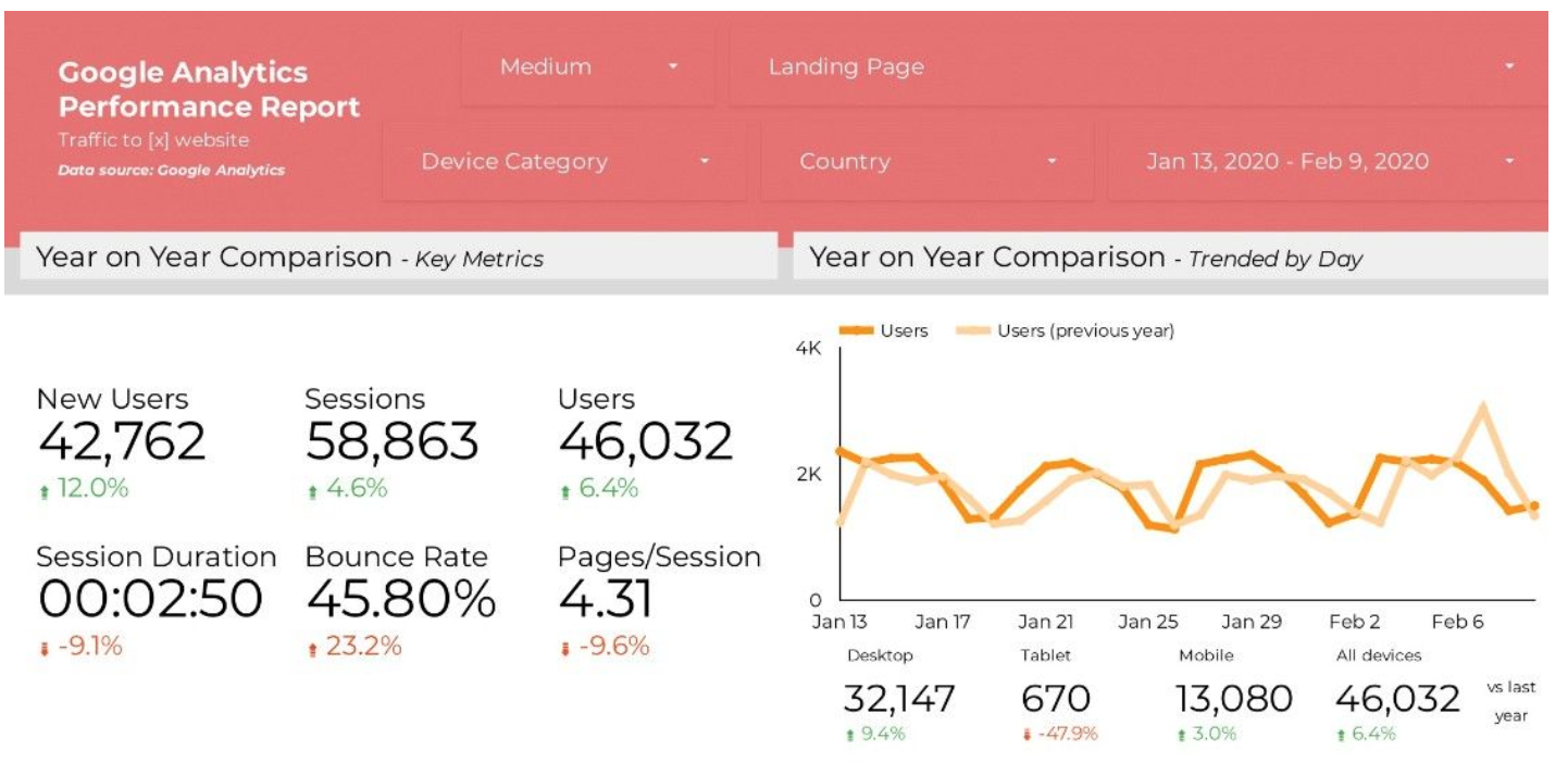 Notice how the red header section includes drop-down menus for filters like country, landing page, and device category? If you want to see if there are significant changes in the data for your US users, you can use a filter to transform the entire dashboard to reflect only US data. This speeds up your analysis and is much better than having to build a new custom dashboard every time you want to drill down on a specific segment of your users.