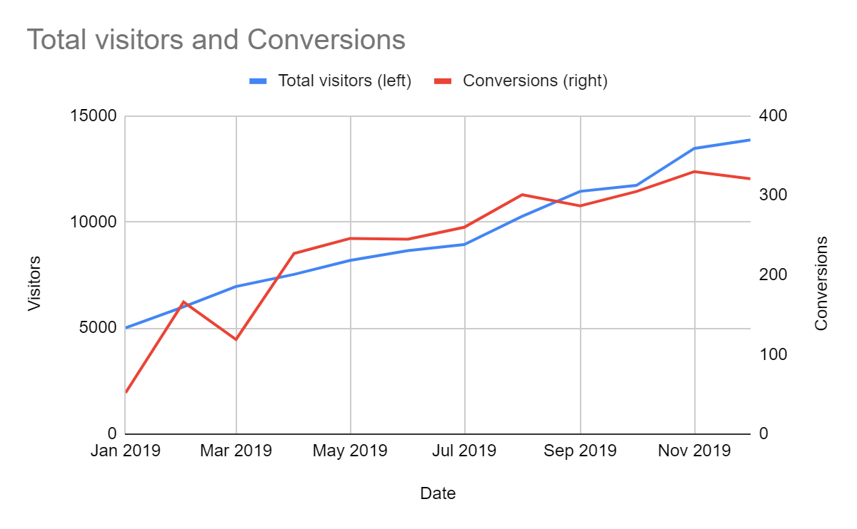 Suddenly, the trend is much more obvious; by using a different scale for each kind of data, it is easy to see that both the total number of visitors and conversions have been trending upwards.