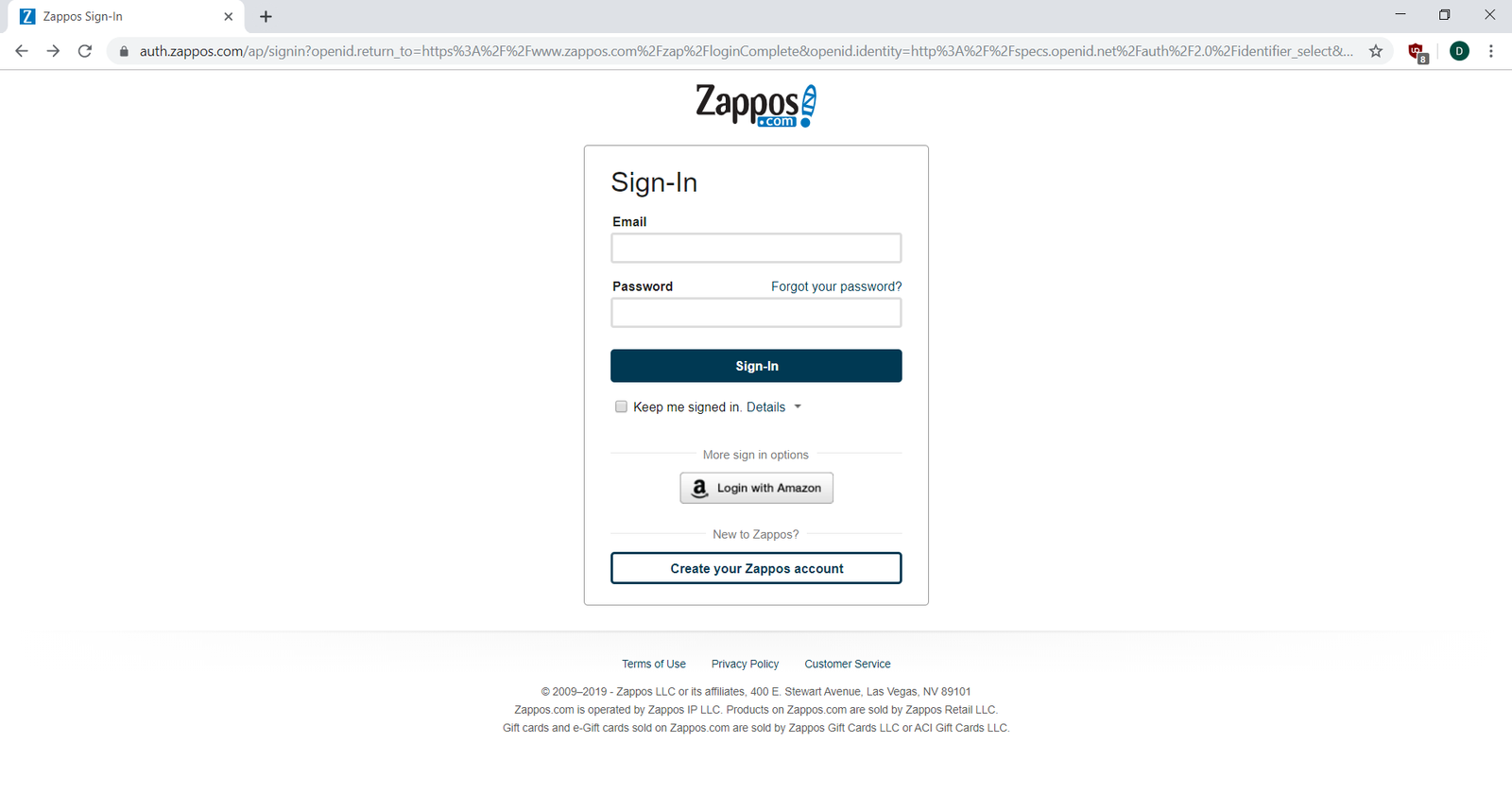 Like most e-commerce sites, Zappos requires the user to sign in before making a purchase. The Zappos checkout workflow offers three options: create a new account if you don't have one, sign in with an existing Zappos account, or sign in with an Amazon account. Once the user is logged in, the checkout workflow is available to enter shipping and payment information: