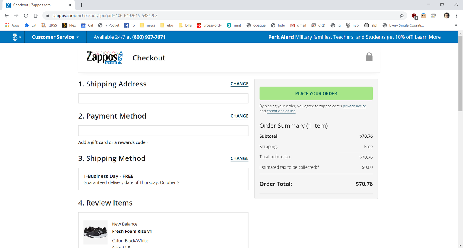 Finally, you buy the shoes! You get one last chance to confirm the order details before purchase. The Place Order button is colorful and prominently placed. This is the critical e-commerce conversion step. Either the customer converts (buys the product), or they abandon the process, and Zappos doesn't make the sale. You'll notice that, unlike on previous pages, there is no search or navigation bar on this screen. Zappos wants to limit the options a user has to navigate away before completing the order.