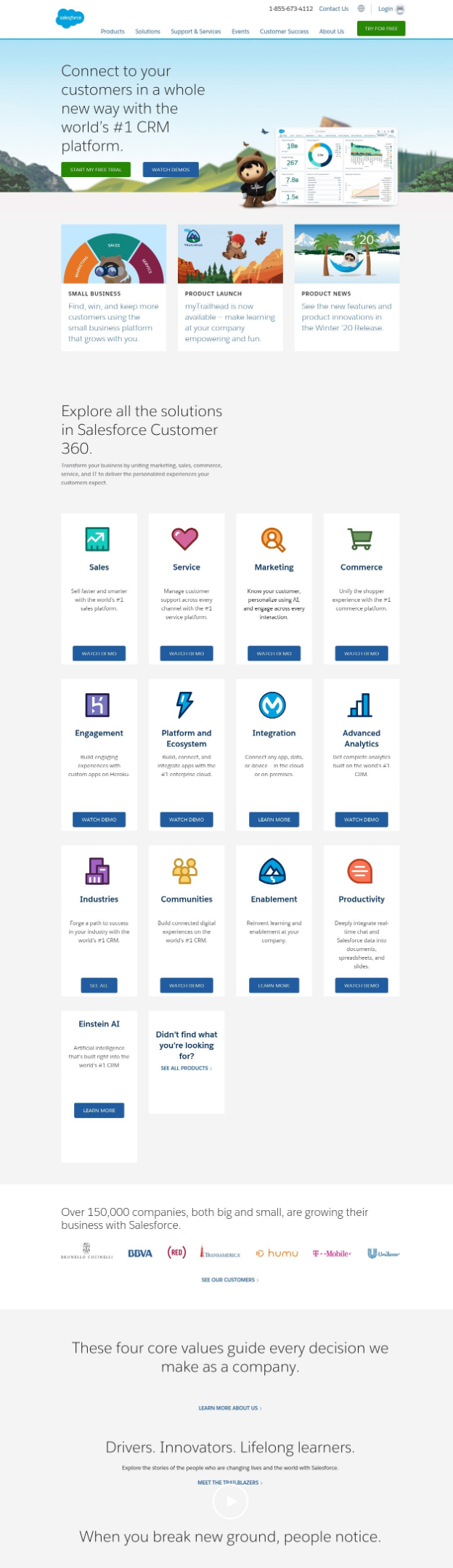 Take a moment to examine the flow of a website to see what it can tell you about the company's goals and design choices. Here's a view of Salesforce's home page: