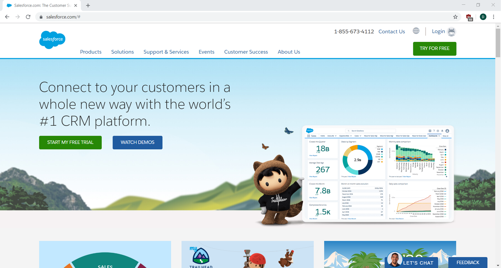 While there are multiple options, the Start My Free Trial choice is emphasized with two colorful buttons: one in the center of the page and one on the top right. Watch Demos is also highlighted. In other words, Salesforce is encouraging you—the user—to investigate and try their product.