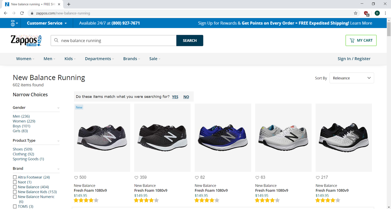 Now, try out Zappos' search flow by searching for "new balance running:"