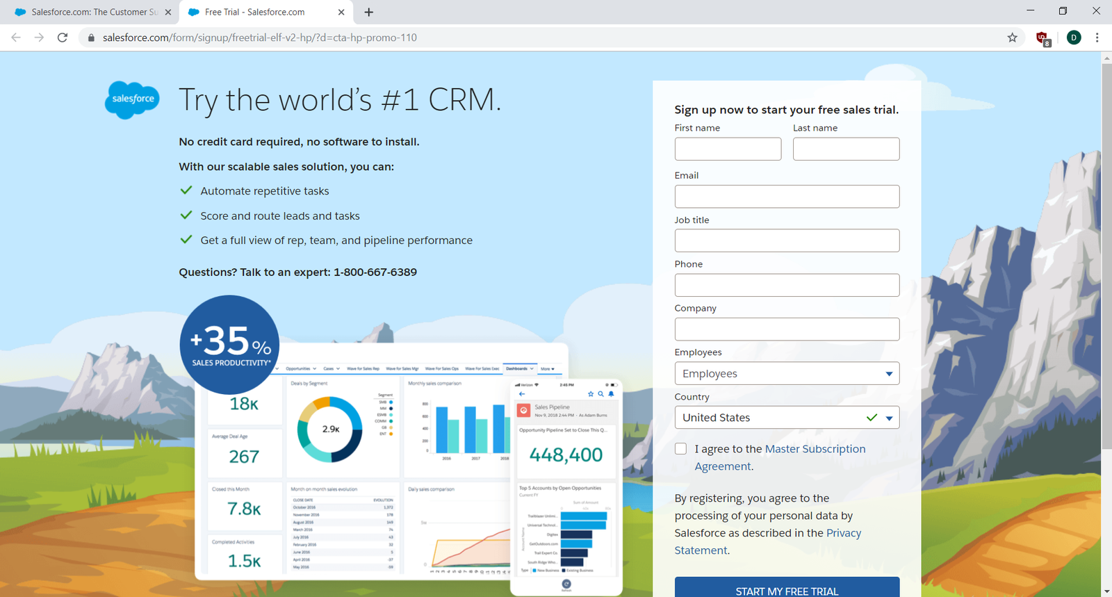 And that's it. You can go from the home page to their trial sign-up in just one click. The value of this path for the user is quick access to try Salesforce. The value for Salesforce is (A) collecting a prospect's contact information for future marketing, and (B) the chance to sign up a trial user, who is much more likely to convert into a paid user as opposed to someone who just browsed the site.