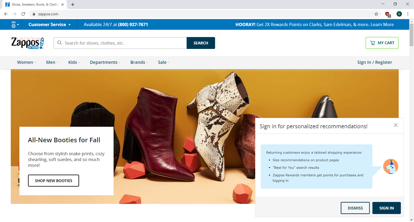 - Sign in for personalized recommendations. What goal do you think this serves? Most likely, Zappos wants returning users to sign in so that they can personalize the content that appears to them. This will increase their conversion rate by highlighting goods a particular user is more likely to be interested in. This is also—again—a way to collect new users' information so they can profile and market to them.