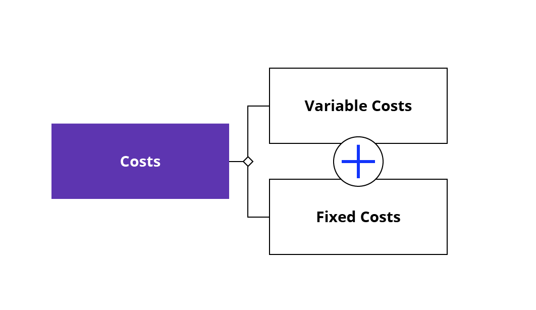 When breaking down costs, there are two main factors to consider: variable costs and fixed costs. Variable costs change based on the number of products. For example, maybe you need to buy one additional server for every 100 subscribers on your SaaS platform. Similarly, advertising expenses can expand and contract rapidly depending on your marketing needs. Fixed costs are independent of the number of products sold. For software products, these can include development labor and office space; your company can hire or fire employees independent of the number of subscribers you have. In this way, software products are different from manufactured products. Labor for software is more fixed, whereas for manufactured goods it is variable. You can see what the two types of costs look like in the diagram below:
