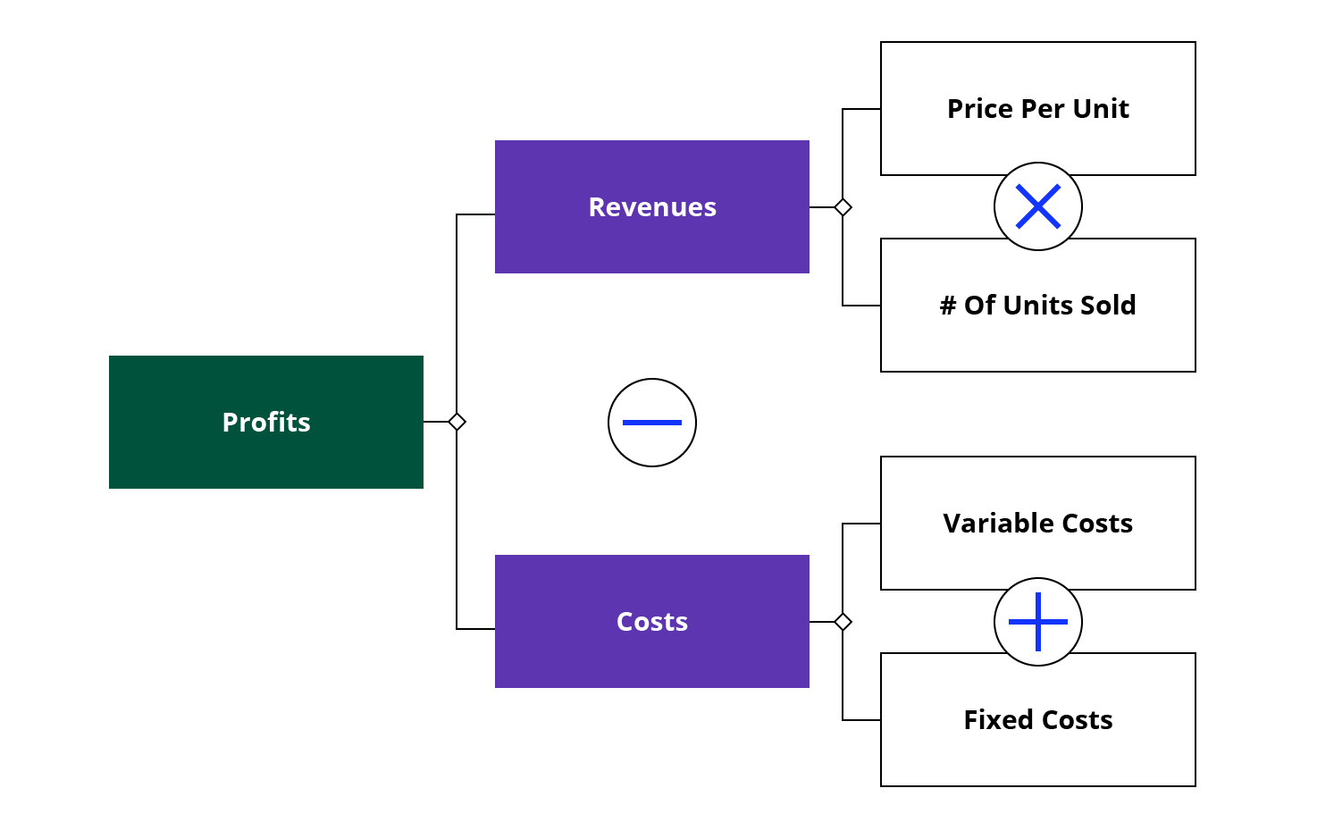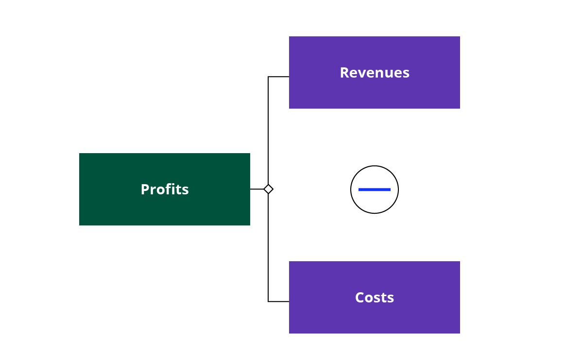 Profit is the goal of most business organizations. In short, profit is the difference between your revenue (the money you take in) and your costs (the money you spend). One way to think about this is by visualizing it as a tree diagram to show how these elements break apart: