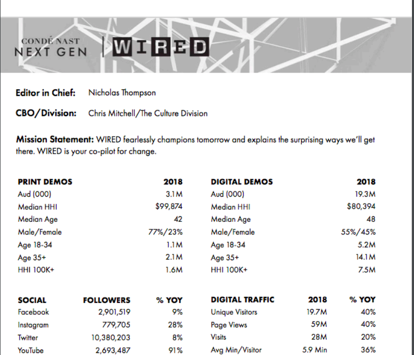 To make themselves more attractive to advertisers, ad-supported businesses usually target a specific group of people. For example, Wired can offer advertisers who are selling products to people in tech a way to reach that very specific audience. Wired even has a website for advertisers to learn more about their audience with details on their demographics, reach, and effectiveness.
