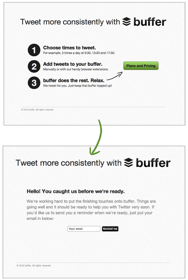 Buffer, a product for managing social media postings, started as a landing page. It advertised and drove visitors to a website that offered a service that didn't yet exist. Users could sign up for a notification when it was ready, which is how Buffer acquired their first users.