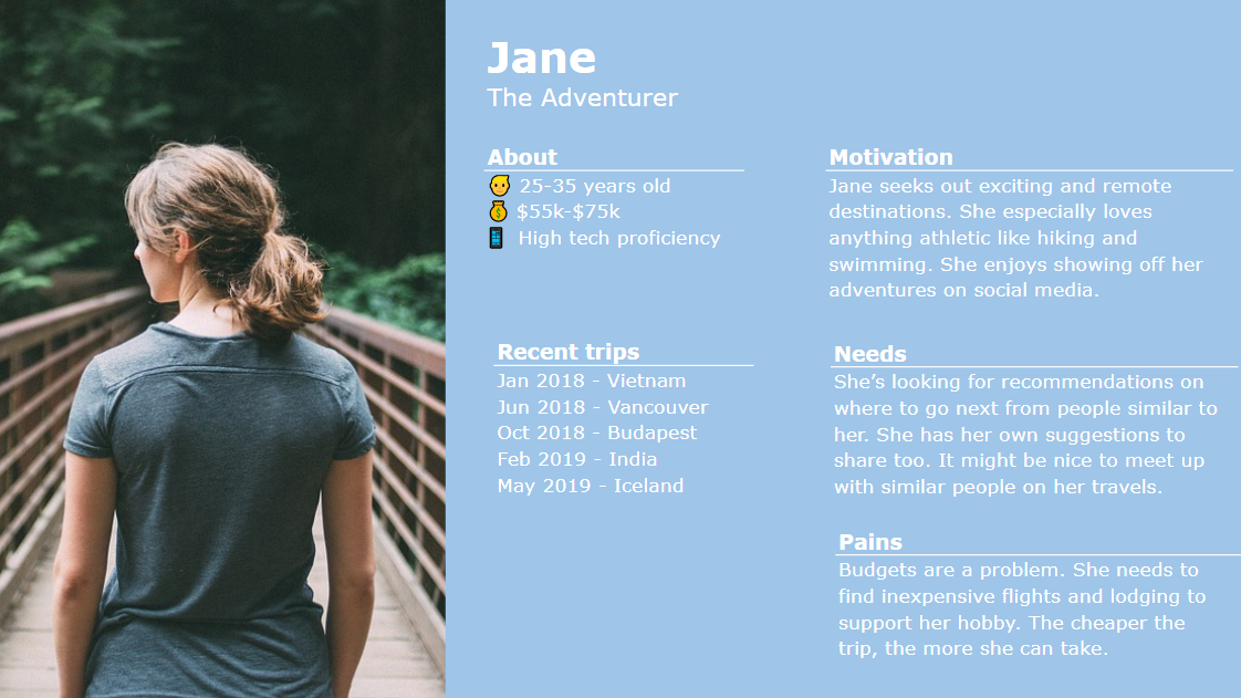 This one was developed for a travel-based social network. Note the "Recent trips" column—sometimes featuring specific traits is useful for rounding out a persona that is specific to your product's industry or area of focus.