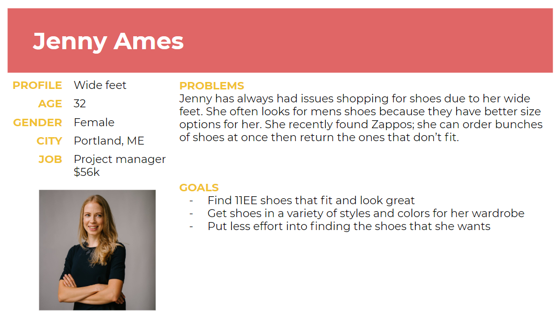Note that the persona is focused on relevant information, like Jenny's shoe profile, her location, and her trouble finding shoes. It also includes her salary, which provides insight into the type of shopper she is. It's succinct and to the point.