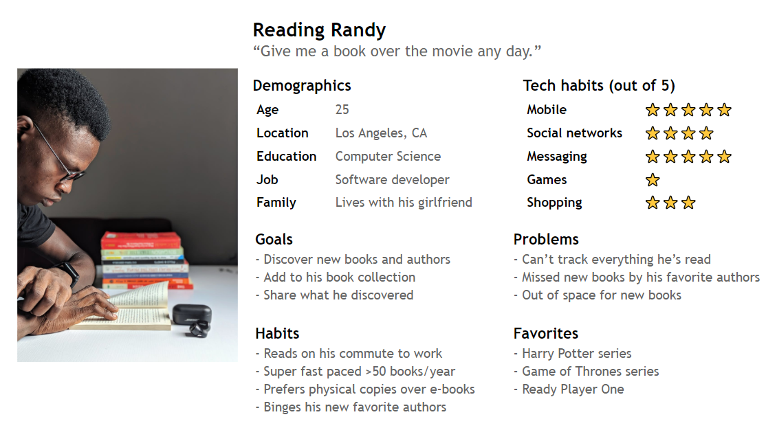 Randy's persona here relies more on lists to present information. As you can tell from the details included, this persona was created for a product related to books. The star ratings are a good way to summarize skills, interests, or other hard-to-explain characteristics.