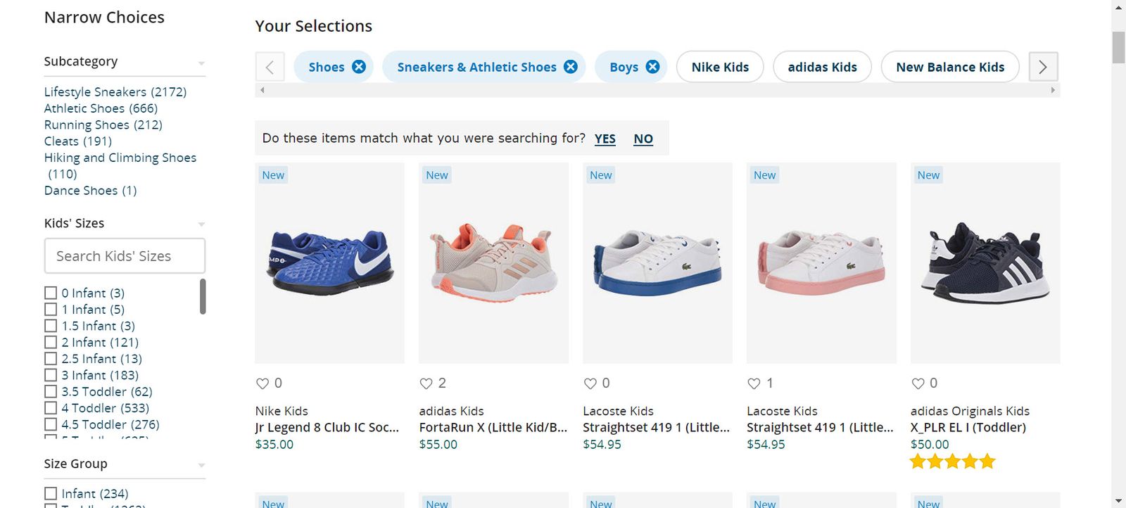 Metadata in products most often appears as filters when you search. Think back to the Zappos search filters for shoes. In the image below, the filters for "Boys" and "Sneakers & Athletic Shoes" are on. For the filter options to be useful, each product needs to have this information filled in completely. Every product has different metadata. What metadata would be useful to collect about a cell phone? How does that overlap or differ from a laptop?