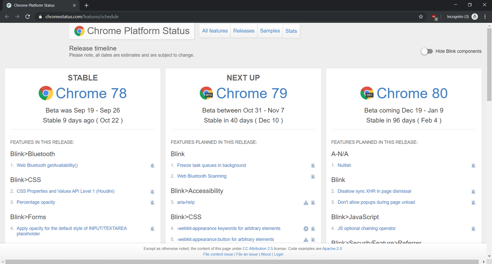 Chrome has a less pretty but still useful roadmap of their upcoming releases and features. It tells you which version will be released, its expected release date, and the set of changes included in that release. The roadmap is especially useful for developers who may depend on certain features in the Chrome browser for their own products.