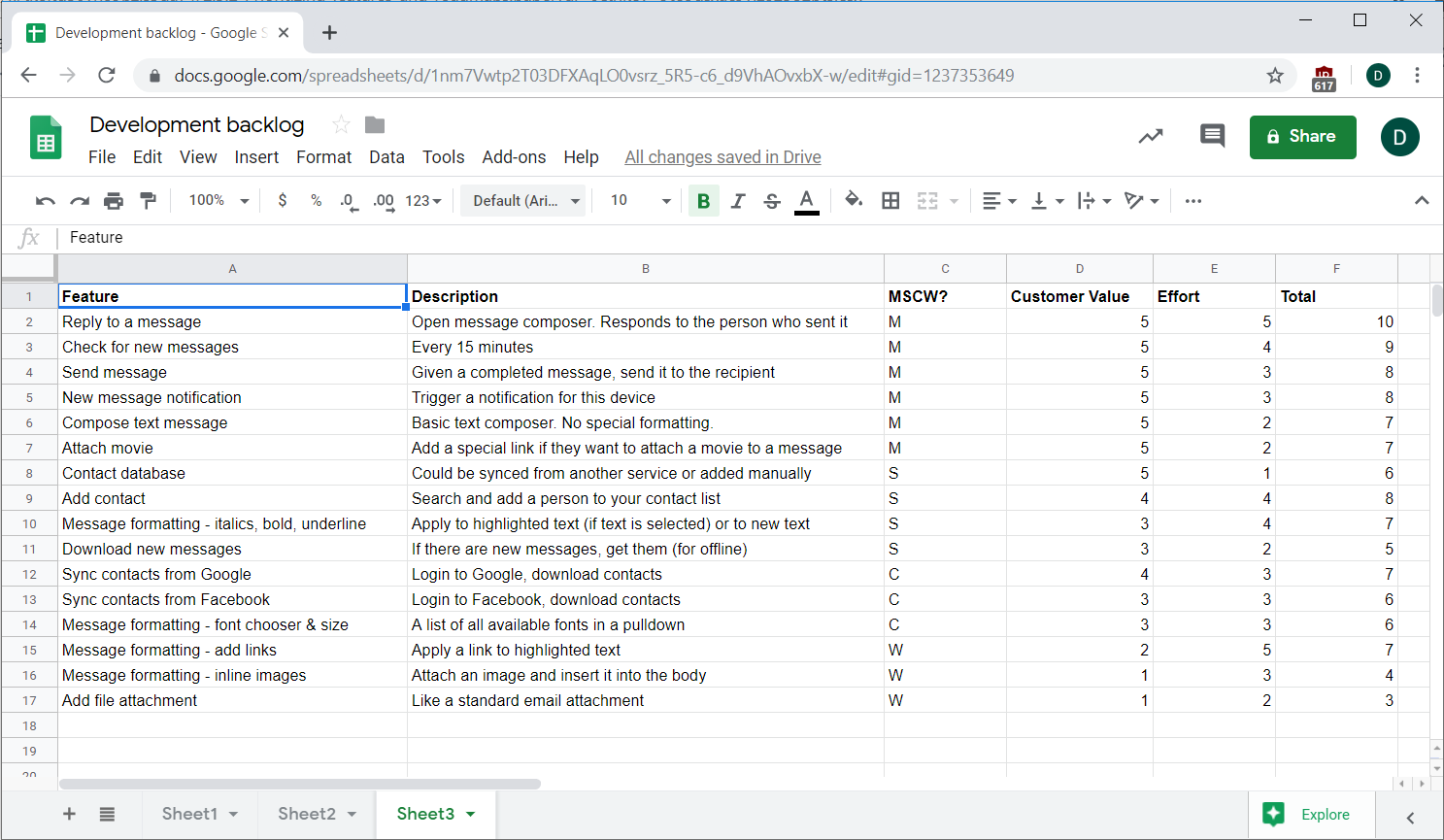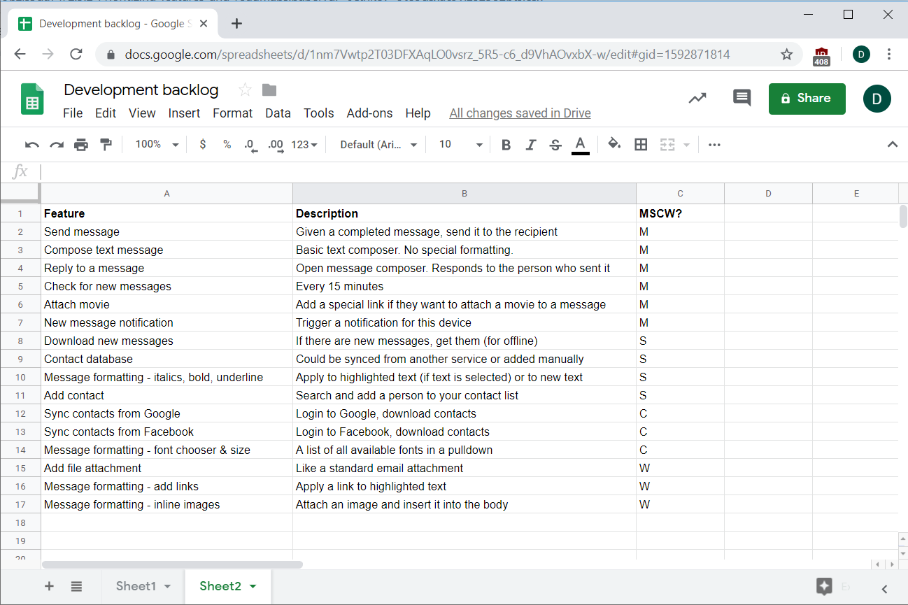 To prioritize these with the MoSCoW method, go through and rank each item as M, S, C, or W—perhaps in a spreadsheet tool, as seen below. The following shows a method for ranking these items in Google Sheets.