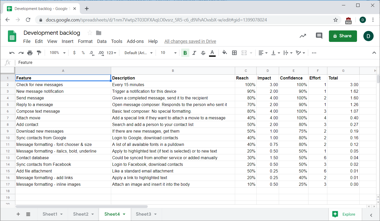 Don't forget that the scoring method does not negate other considerations, like dependencies between items. For instance, in the image below, note that the Contact database item has a lower total value than some other items in the S group, but it's higher on the priority list because it's a prerequisite for other contact features: