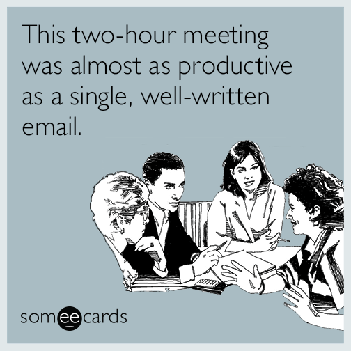Meetings will be a frequent part of your work life at any company you end up working for. Many people consider work meetings to be a necessary evil, and internet jokes on the uselessness of meetings abound. But meetings don't have to be ineffective. Preparation on the part of the participants, and especially the person running the meeting, can ensure that meetings are useful. In your role as PM, you will have to run many of these meetings yourself, so invest some time now to think about how you can make your meetings better than most.
