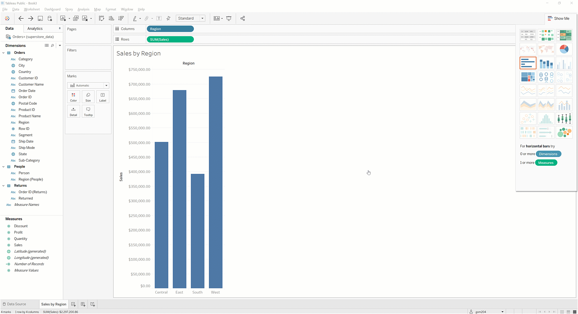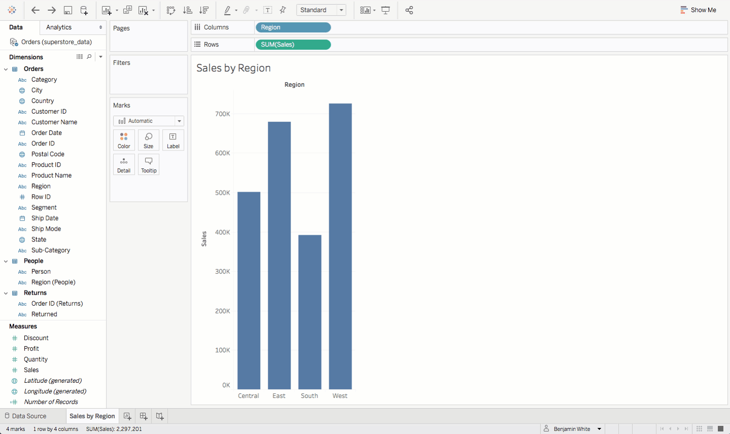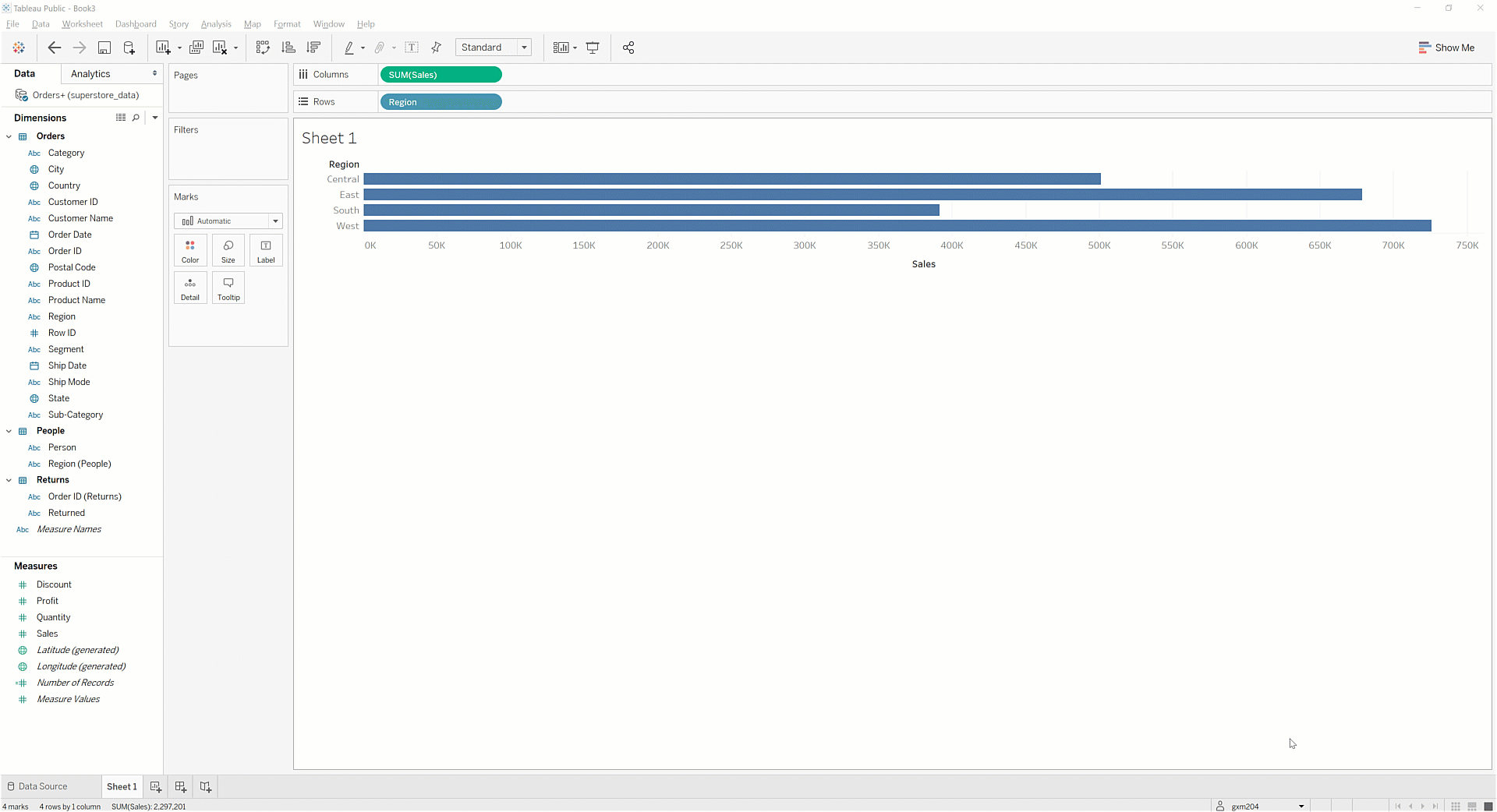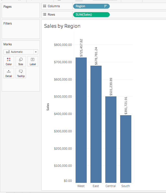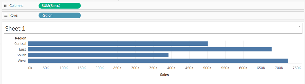 Tableau now groups unique values in the variable Region into rows. Leaving Region in the rows, drag Sales into the columns. This is your first deliberate visualization! Tableau knows to aggregate sales because it is a continuous measure. It creates a bar chart of sales by region. You should see something like the chart below: