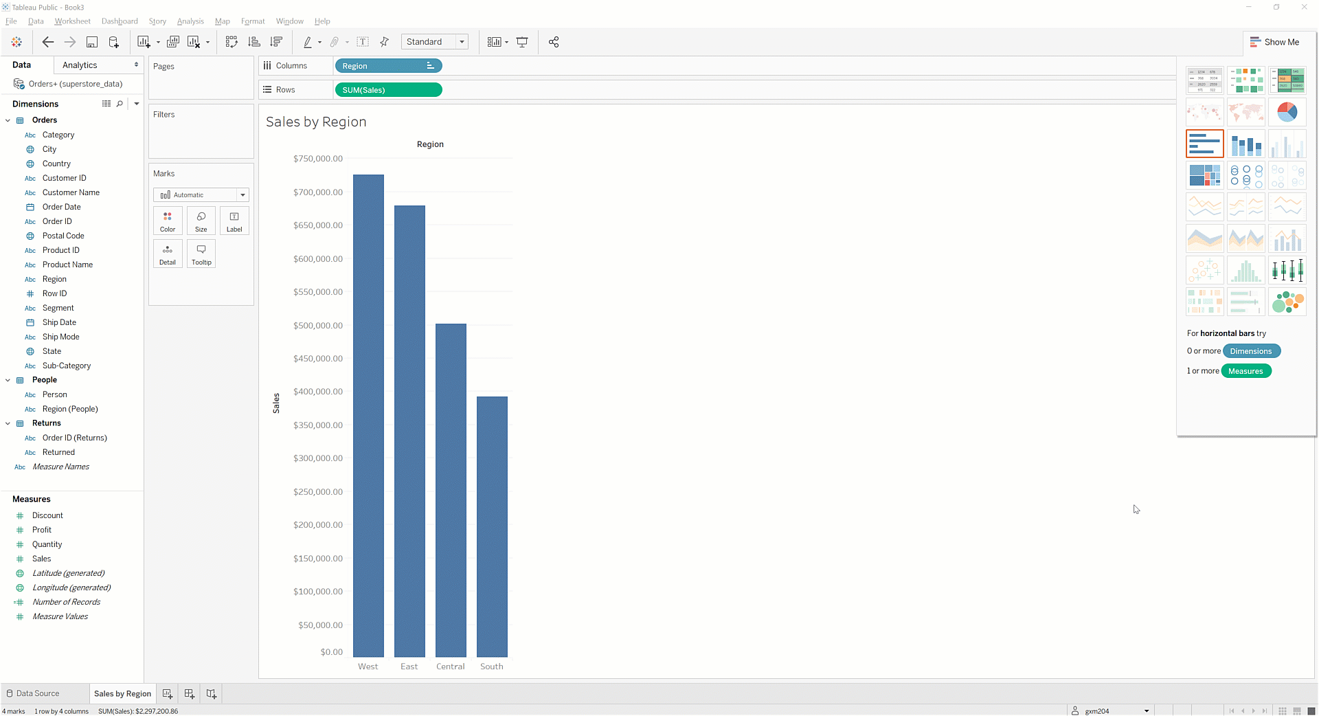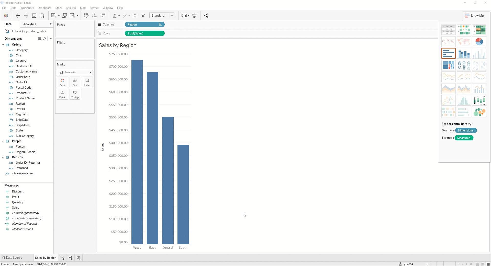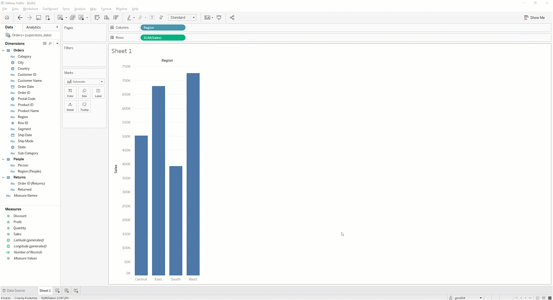 Tableau now groups unique values in the variable Region into rows. Leaving Region in the rows, drag Sales into the columns. This is your first deliberate visualization! Tableau knows to aggregate sales because it is a continuous measure. It creates a bar chart of sales by region. You should see something like the chart below:
