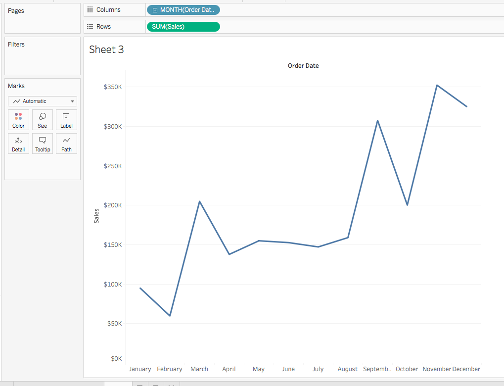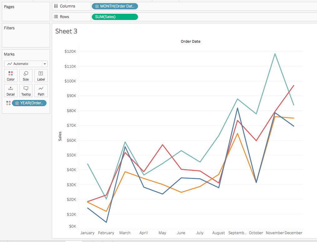 Next, create distinct lines for each year. To do that, drag Order Date from the Data pane to the Color button in the Marks card. Now, you can see all four years in the chart and compare monthly sales by year. Your chart should look like the image below: