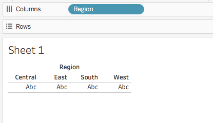 At the top of the page, right above the Sheet 1 title, you'll see a Rows shelf and a Columns shelf. As you've done before, drag Region to the Columns shelf. You will see the image below: