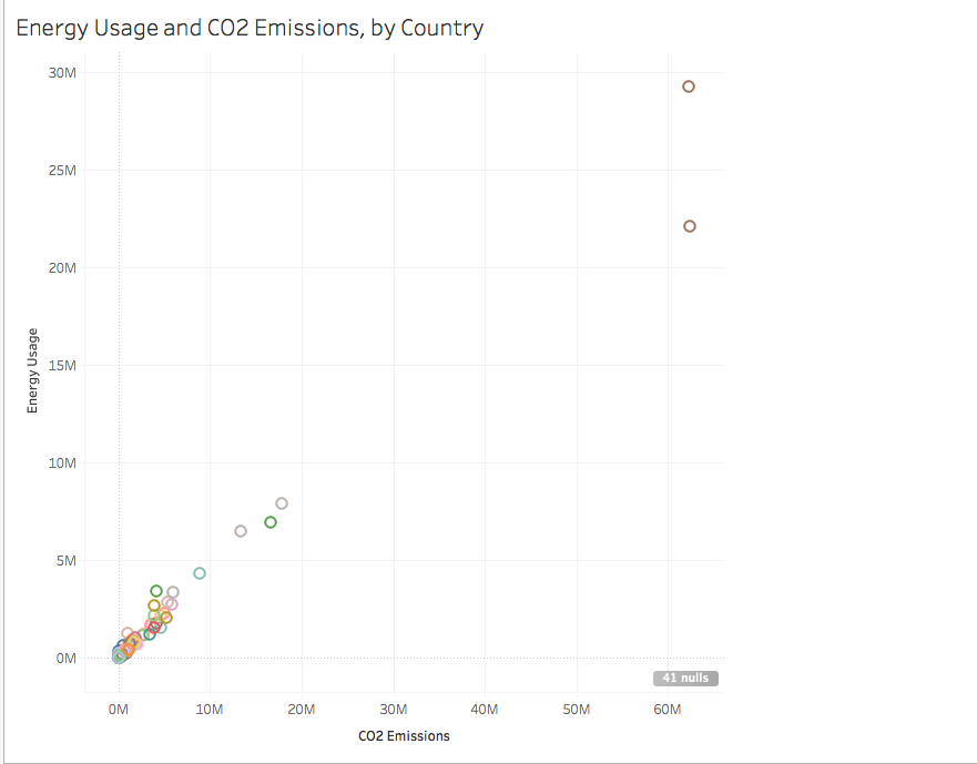 Create a scatterplot that plots energy usage on the y-axis and C02 emissions on the x-axis for each country in the dataset. Your chart should look like the image below, though the colors might differ: