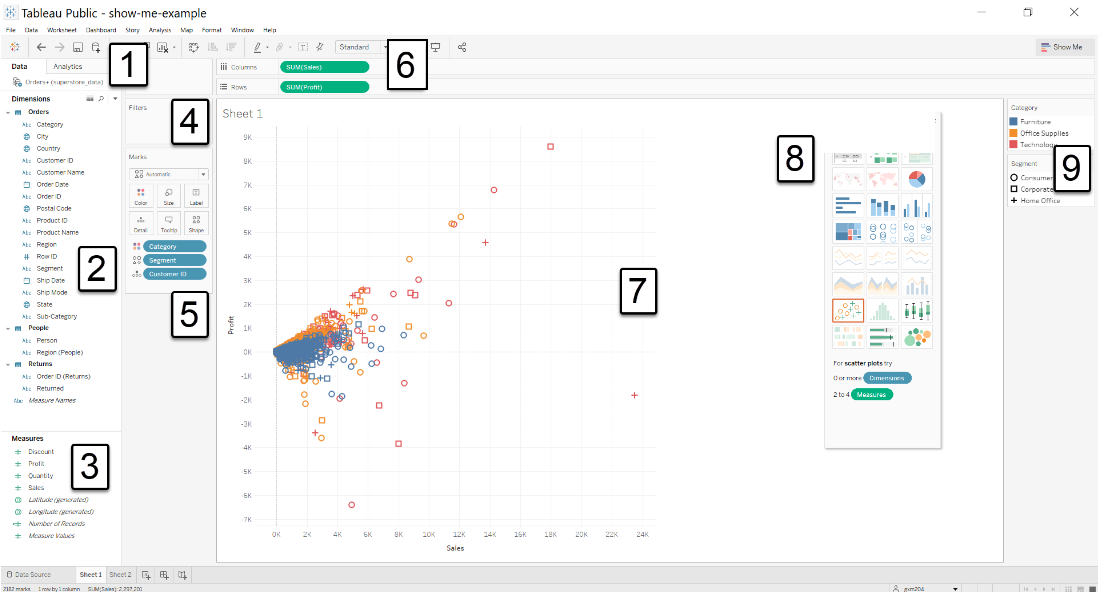Tableau has a unique vocabulary. It uses terms like pills, shelves, and dimensions. A typical workspace includes several arrangements of data with these Tableau concepts. This checkpoint will dissect the Tableau workspace below. What does each element do or mean? And what should you call them? Follow along with the numbers in the visual below to get a sense of each element: