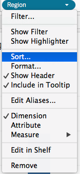 Right now the regions in your visualization are sorted by region name, which is not visually compelling. Sort the data in descending order by sales so that the top-selling region is on the far left. In the Rows shelf, right-click the Region field or click the arrow in the field. You will see the screen below: