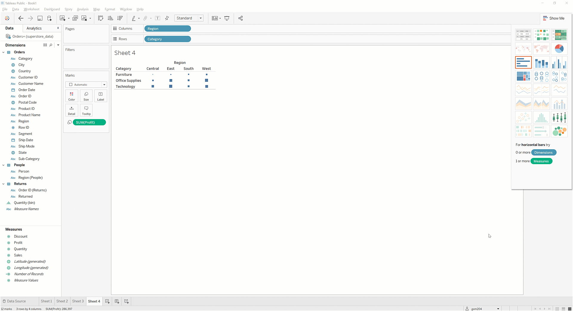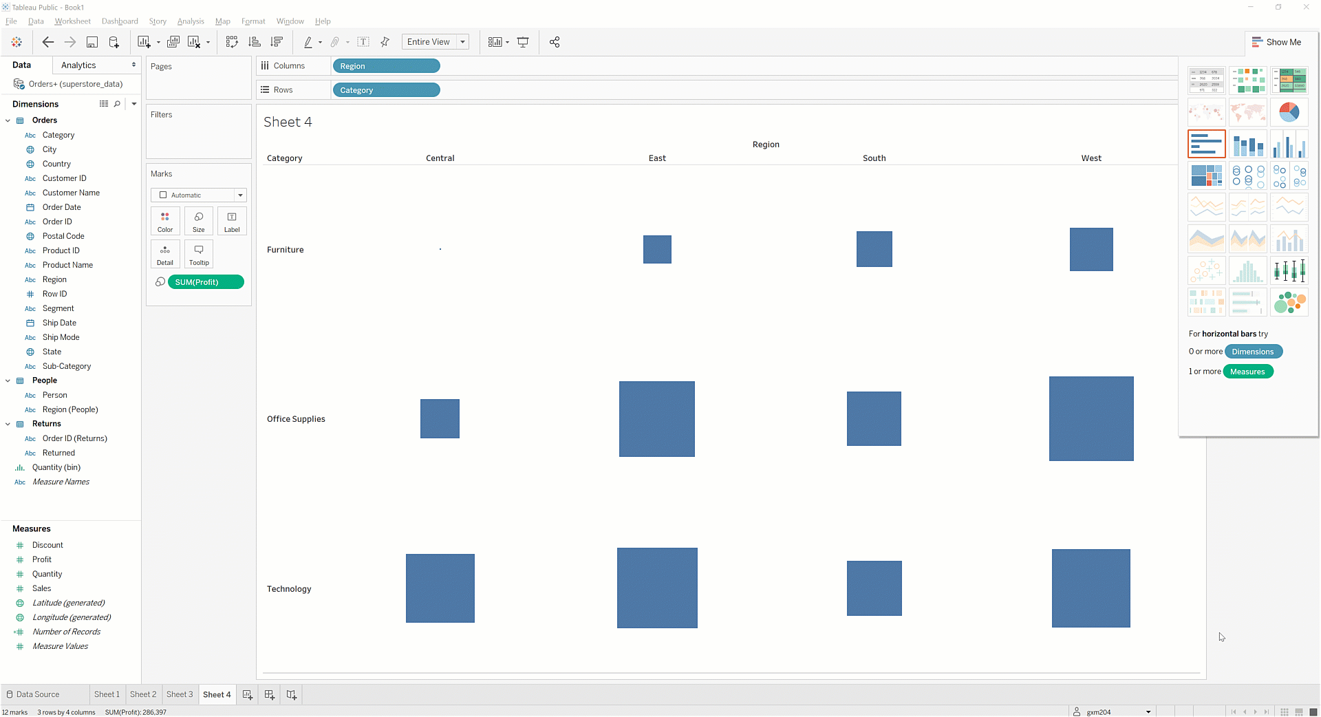 Try it out. First, create a new worksheet. Then, drag Region to Columns, Category to Rows. Add Profit to Size, which is in the Marks card. Next, in the toolbar, switch the Fit drop-down menu from Standard to Entire View. This will expand the visualization to fit the window and make it easier to read.
