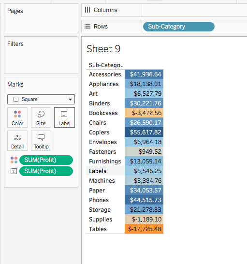 Sometimes, you'll want to see your data in a table form, but you'll want to shade the table based on a dimension. One quick way to do this is to make a highlight table. You can try it out! Create a new worksheet, and drag Sub-Category to Rows. Then, drag Profit first to Color and then to Label. Finally, change the Marks card's drop-down menu, change the setting from Automatic to Square.