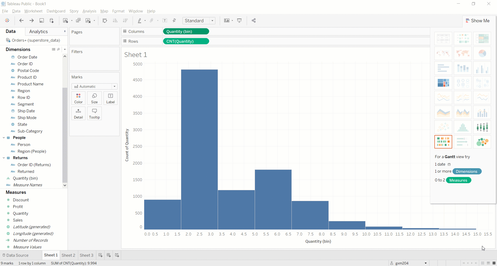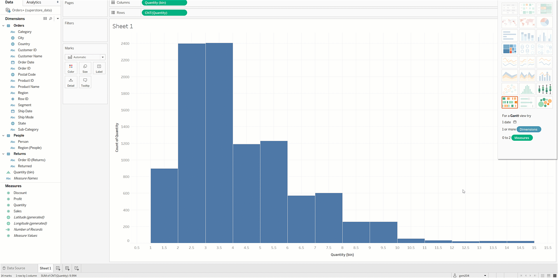 Next, put this into action. First, try to understand the distribution of item counts for orders. Create a new worksheet. Drag Quantity to the Columns shelf. Then, click Show Me and select the Histogram icon. You should see something like this: