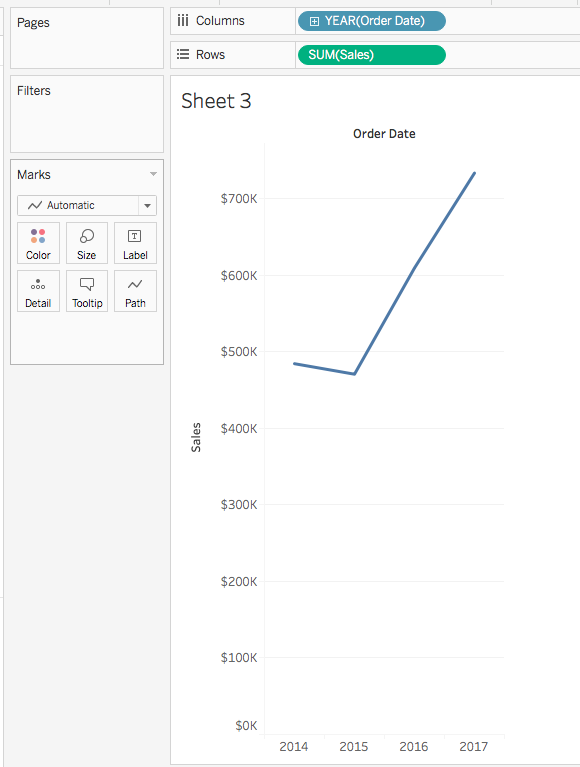 To create the chart, first drag Order Date to the Columns shelf. You'll see that Tableau automatically groups the data by year. Drag Sales to the Rows shelf. You should see something like this: