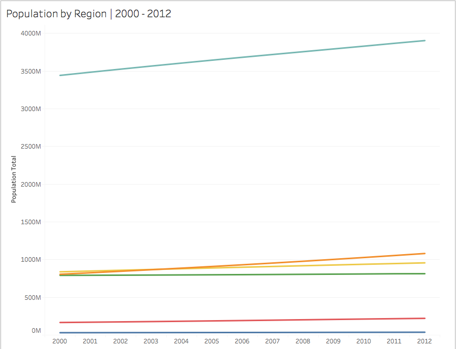 Create a line chart that shows the population of each region for each year in the dataset. Each region should have a separate line. Your chart should look like the one below, but note that the line colors might differ: